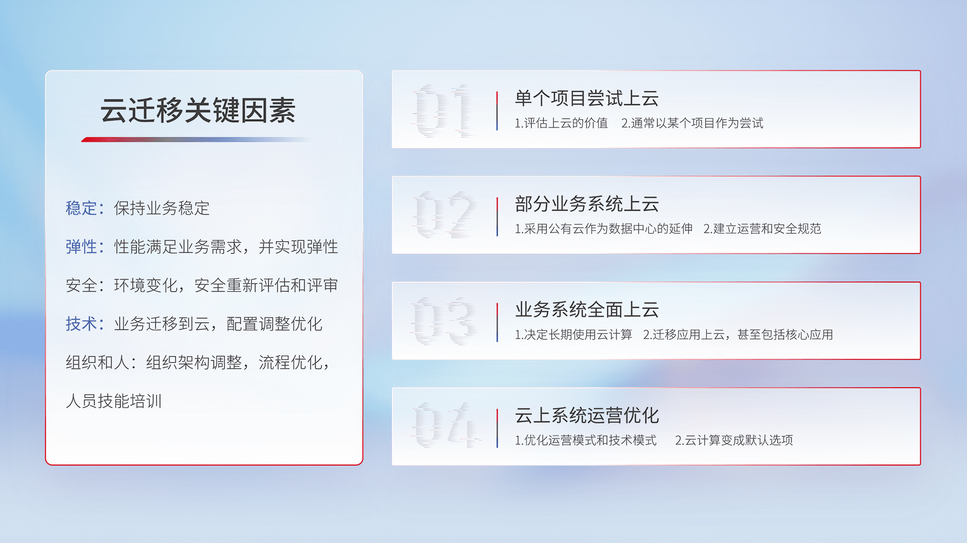 结合实际业务,,,,从规划设计、、、、云平台选型、、云原生改造、、、数据迁移、、、、集成交付,,迁移全过程为客户识别最佳上云路径,,,做好风险识别管理,,,,设计网络架构、、身份权限、、安全审计合规、、、操作审计、、、日志审计、、、、监控告警策略、、、、多站点容灾设计等,,对云上基础设施进行整体规划,,,提升IT治理水平,,以满足弹性、、高可用、、高性能的需求。。。。