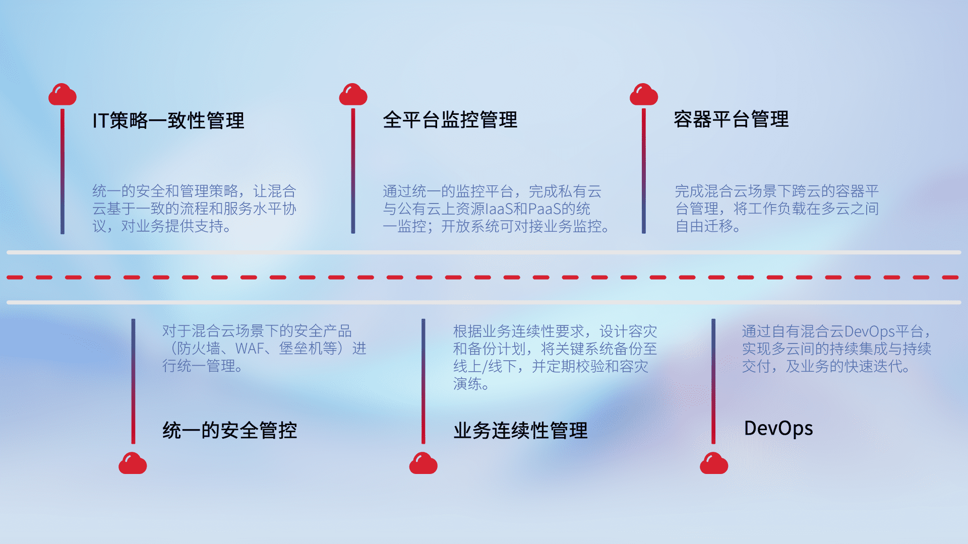 通过多云纳管,,,以统一的资源数据模型把客户的云资源进行抽象和封装,,,进而实现对多云资源的统一操作,,,,保障云资源管理的可靠性、、、、稳定性与可用性。。量身定制化运维内容,,,,配置、、、开发运维、、补丁管理、、、备份、、、监控、、、认证和访问管理、、、审计和日常巡检等,,保障在用云过程中的可靠度,,,,稳定度以及高可用率。。。